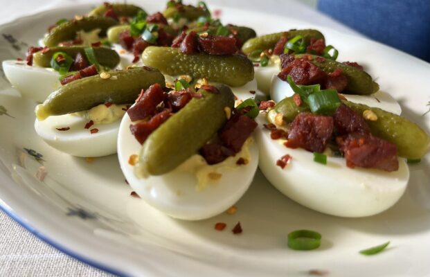 Sultingi įdaryti kiaušiniai su pikantiška čioriso dešra: puikus užkandis Jūsų stalui