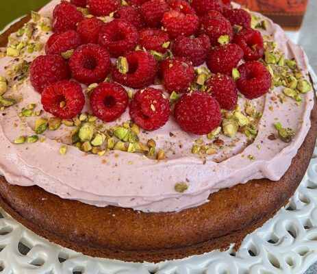 Pistacijų pyragas su aviečių kremu: pavasario švenčių stalo žvaigždė