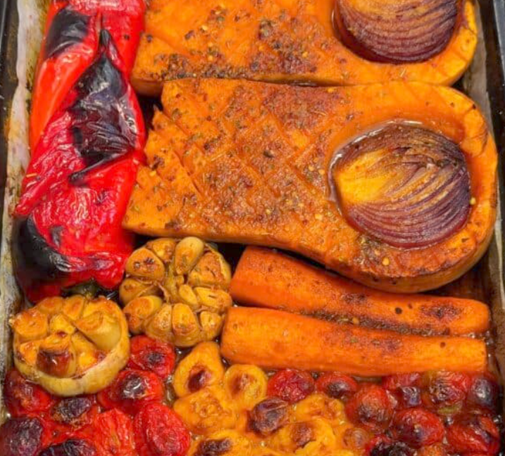 - Kepimas: kepkite apie 1,5 valandos, kol daržovės taps auksinės ir minkštos. Jei pjaustėte smulkiau, laikas sutrumpės. Likus 10 minučių iki galo, nuimkite foliją, kad daržovės šiek tiek karamelizuotųsi.